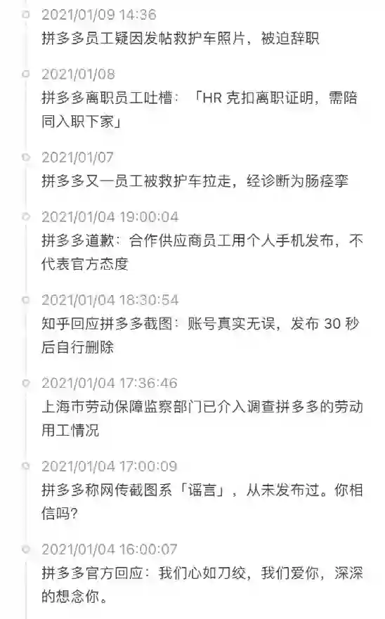 随后,「员工在家中跳楼离世」、「员工被救护车拉走,经诊断为肠痉挛」、「员工疑因发帖救护车照片,被迫辞职」被网友热议。