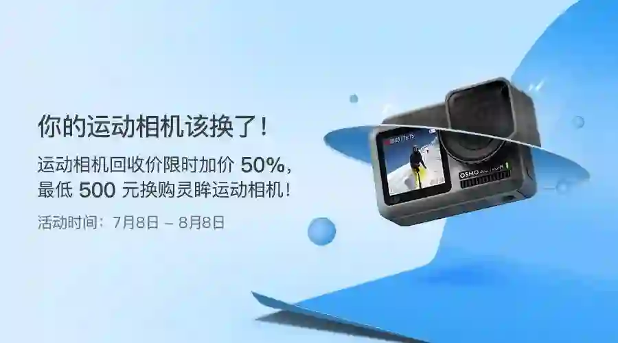 即日起至8月8日期间,DJI大疆正在进行“你的运动相机该换了!”以旧换新活动,最低500元即可换购 Osmo Action 灵眸运动相机。大家只要拿着手中的闲置运动相机,去到 DJI 大疆官方商城的以旧换新活动专区,均可获得高价回收,同时还将享有高达50% 的额外补贴。换取的DJI币可直接用于商城消费,拥有DJI大疆最新影像科技产品灵眸运动相机。