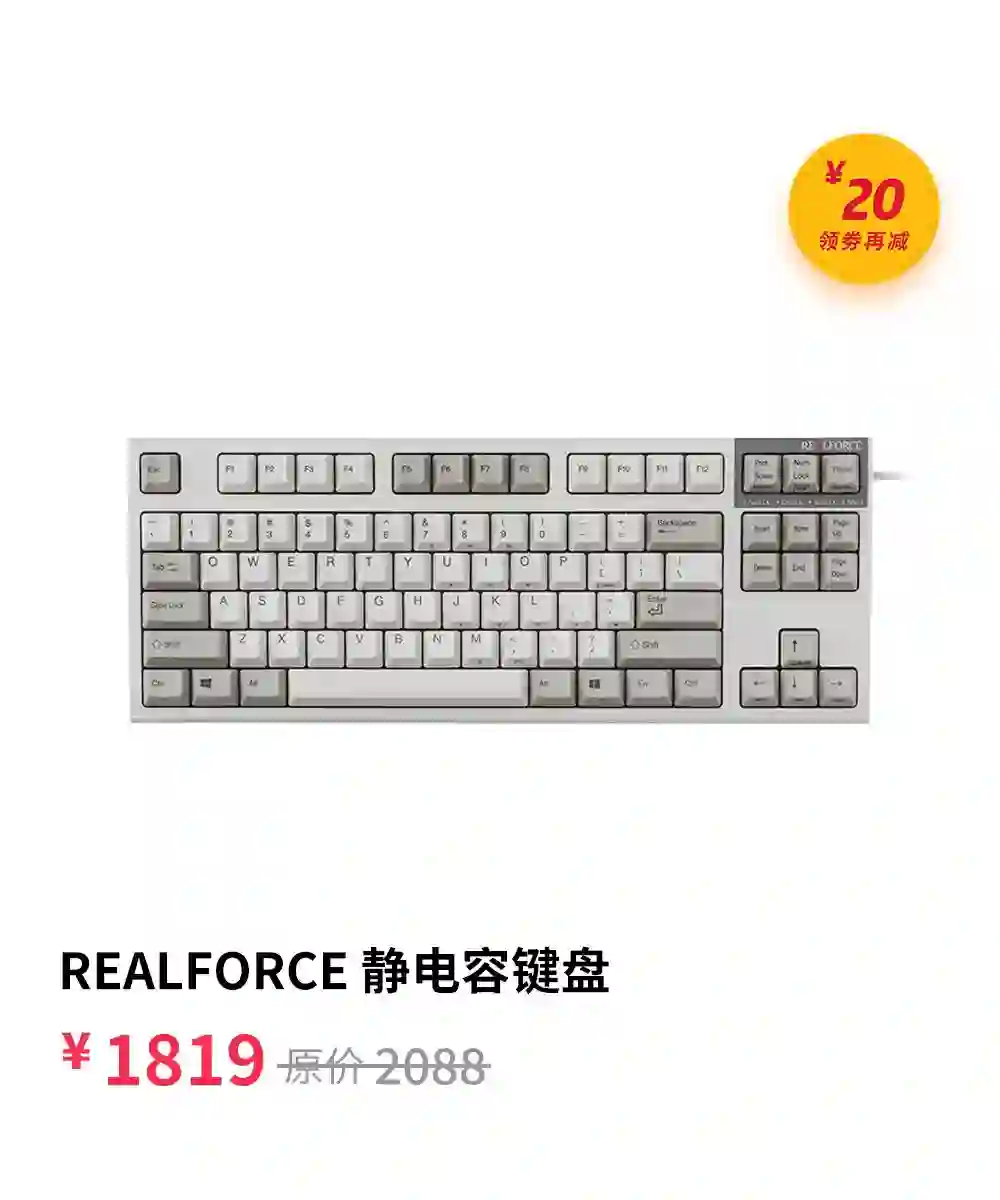 HHKB 全称 Happy Hacking Keyboard,于 1996 年 12 月 20 日诞生于日本。如今已成为程序员和文字工作者心目中的神器。HHKB 采用静电容轴,由于是无触点设计,所以几乎无磨损。相比机械键盘,无物理触点的设计有着比机械键盘更长的使用寿命。