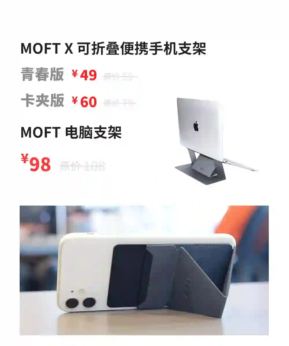Moft 粘贴式隐形手机支架采用可重复使用、不留胶的粘贴材料,让你可以随心粘贴和拆除。横放、竖放都可以稳当支撑,展开支架时拿手机,还可以成为手机防滑垫。内置磁片可以让手机轻松吸附在带磁铁的支架上,卡夹版可以收纳三张卡片,把地铁卡或银行卡收纳其中,让你日常出门更为轻装。