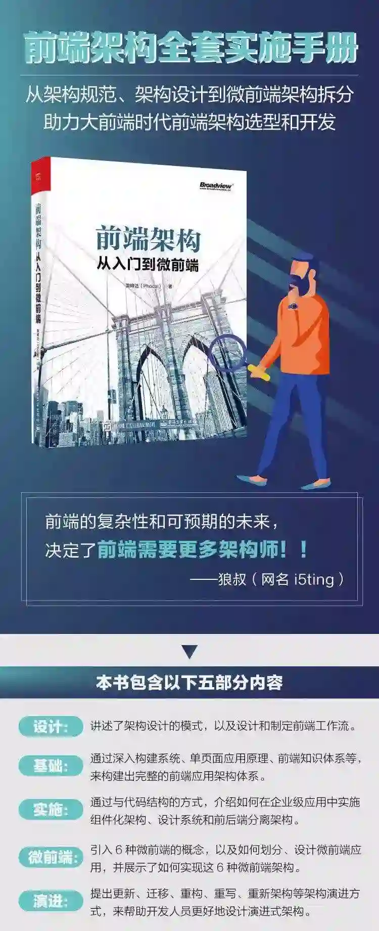 可直到 2017 年底,我开始接触一系列的复杂前端应用时——多个系统集成,又或者是多团队并行开发,大量代码应用时等。我才发现:在前端领域,缺少这样的一本书,来告诉开发人员怎么去做前端架构。