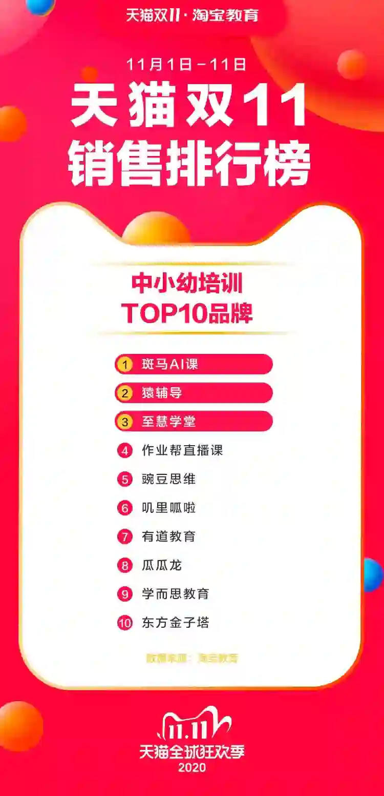 从今年双十一斑马AI课旗舰店的战绩来看,已经可以很好地打消这种疑虑,因为其引领势头和创收能力并没有因为竞争对手的增加而减弱,反而越来越强。今年双十一“网课”作为全新品类成为了爆品,不少网课直播间人气爆棚,据相关数据统计,预售首日仅天猫平台,购买网课的人数就比去年增长649%,花在教育上的消费同比增长1566%。其中,斑马AI课旗舰店更是分别在11月1日和11月11日两天均取得淘宝教育中小幼培训类销售榜第一的成绩,这也从侧面说明了斑马AI课目前有多火。