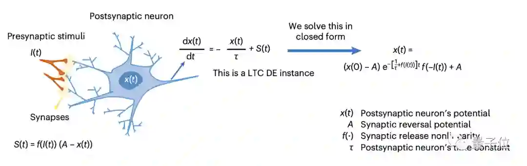 这次MIT的突破,在于找到了两个神经元之间通过突触相互作用微分方程的近似解析解。