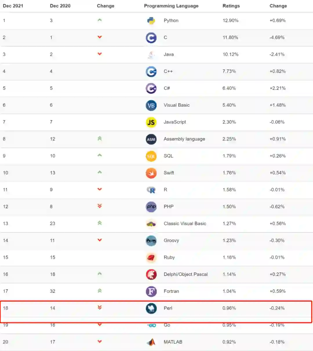TIOBE发布了今年12月的编程语言排行榜,前20名的榜单里,Perl一直处于下游阶段。相比于Python,Perl的境遇显得有些惨淡。当人们讨论“最受欢迎的编程语言”的时候,也很少有人会提到Perl。
