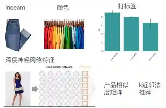 产品特征是通过深度神经网络学习得到的,通过分析图片,对每一个产品的图片放到深度神经网络中,生产一些进程,把每一件产品进程可计算产品相似度矩阵,这样就可以用邻近法进行推荐。