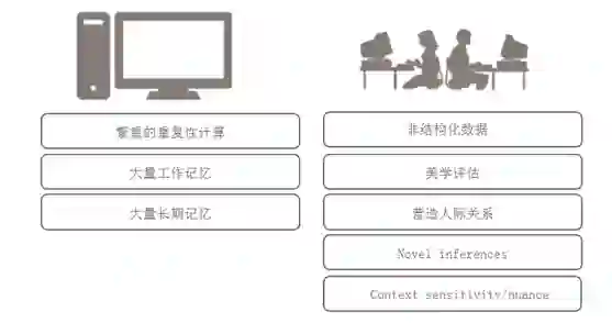 如上图,左边是计算机,右边是人,计算机可处理比较繁重的重复性计算,另外计算机的短期记忆与长期记忆都是人所不能媲美的。