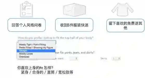 Stitch Fix 会搜集用户个人风格问卷,结合算法和造型师的建议进行推荐。之后,用户会收到五件不同的衣服,可在方便的地方试穿及与其他衣服进行搭配,喜欢留下来,不喜欢退回。