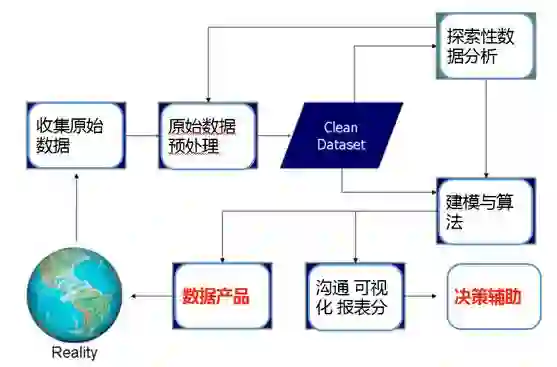 之后,对原始数据进行预处理,也叫数据清洗,因为原始数据会有很多冗余、重复信息、变量缺失以及错误。基于清洗过的数据集,可以做一些探索性分析和机器学习。