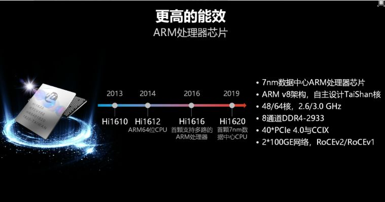 而另外一个亮点是,邱隆也展示了首个基于 Arm 架构发展的服务器计算芯片,并自主设计了基于 Arm V8 架构的 TaiShan 核心,基于 7nm 工艺制造,最大提供到 64 核配置,并支持双 100GE 网络和 8 通道 DDR4-2933,在算力上拥有不逊于业界竞争对手的表现。
