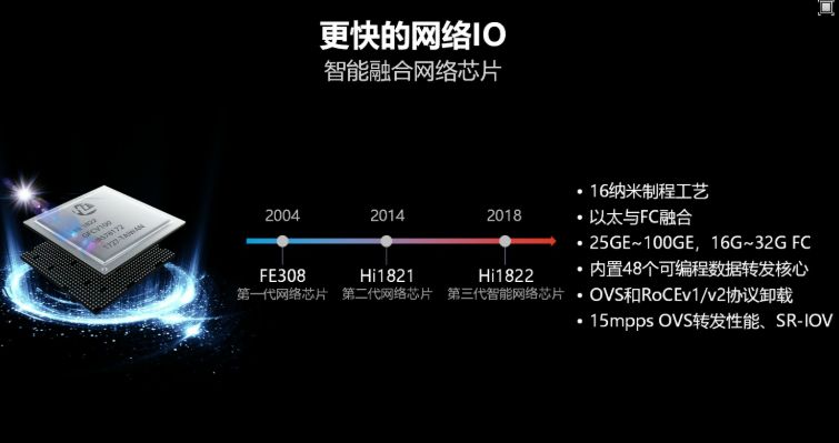 另外,华为也在大会上发表了新一代智能网络芯片,基于 16nm 工艺制造,实现了以太与光纤通道融合,并内建 48 个可编程数据转发核心。