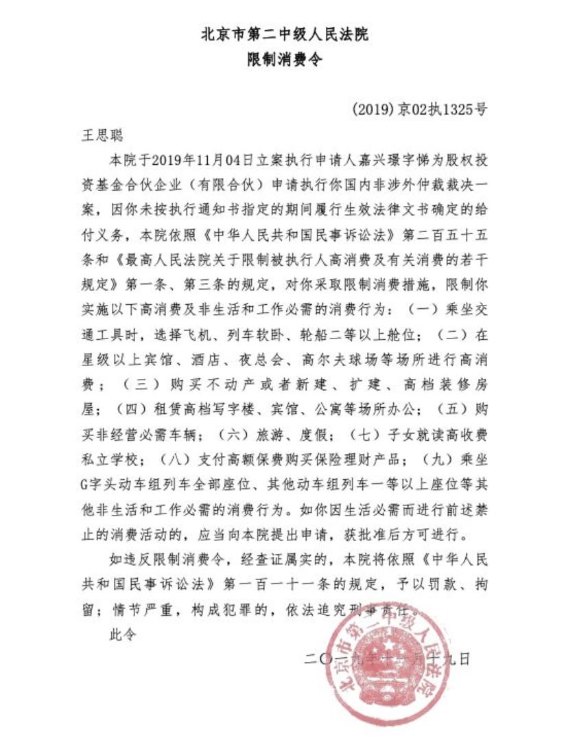 据中国执行信息公开网查询显示,法院已在11月19日向王思聪下达了限制消费令。