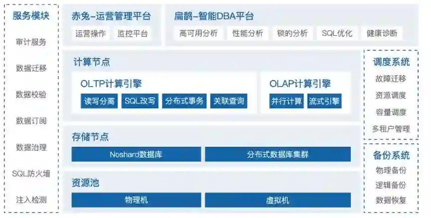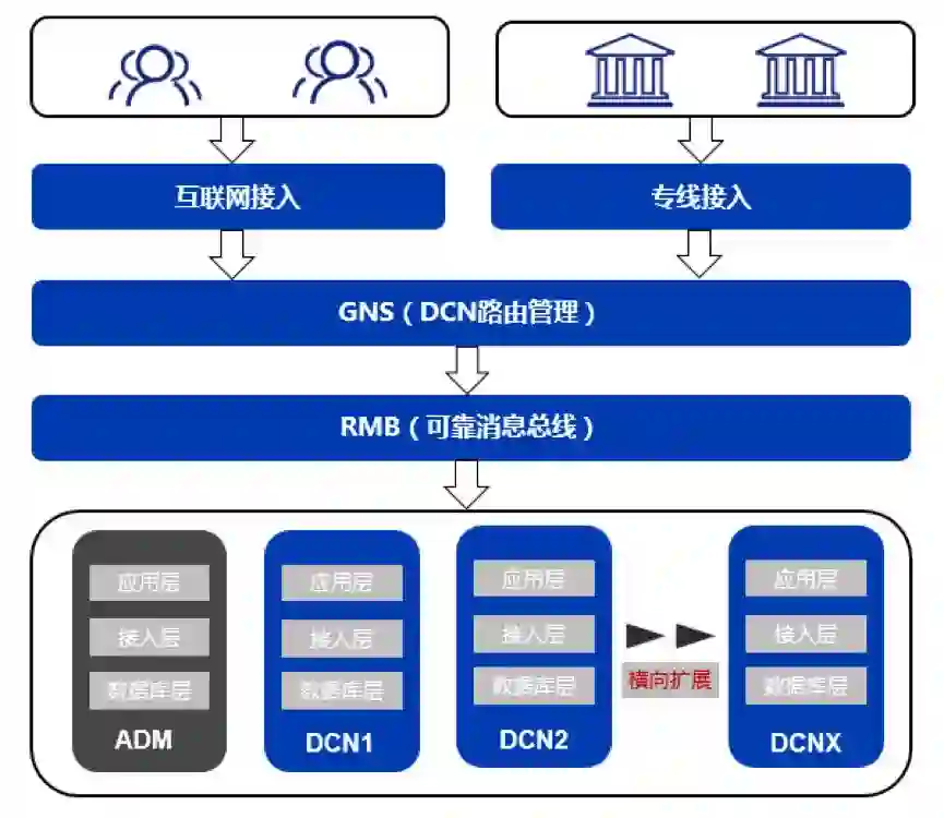 前文提到,微众银行为了实现业务规模的水平扩展,设计了基于DCN的分布式可扩展架构,从而即实现了扩展性,也保证了数据库层面架构以的简洁性。 DCN,即Data Center Node(数据中心节点),是一个逻辑区域概念,DCN是一个自包含单位,包括了完整的应用层,接入层和数据库。可以通俗的理解为,一个DCN,即为一个微众银行的线上的虚拟分行,这个虚拟分行只承载微众银行某个业务的一部分客户。通过一定的路由规则(比如帐户号分段),将不同的客户划分到不同的DCN内。一旦某个DCN所承载的客户数达到规定的上限,那么这个DCN将不再增加新的客户。这时通过部署新的DCN,来实现容量的水平扩展,保证业务的持续快速发展。 不同的客户保存在不同的DCN,那么就需要有一个系统来保留全局的路由信息,记录某个客户到底在哪个DCN,这个系统就是GNS(Global Name Service),应用模块会先请求GNS,拿到对应客户的DCN信息,然后再去请求对应的DCN。GNS使用了redis缓存,以保证较高的查询QPS性能,同时采用TDSQL做持久化存储,以保证数据的安全性。 RMB(Reliable MessageBug),可靠消息总线,是DCN架构的另一个核心模块,主要负责各个业务系统之间高效、准确、快速的消息通信。DCN的整体架构如图所示: 图4:DCN架构模型