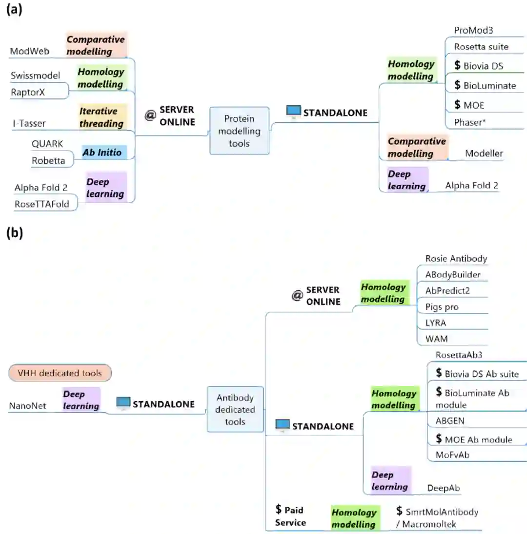 图:蛋白质结构预测工具。(a) 通用蛋白质建模工具和 (b)抗体和VHH建模工具总结。所有工具都根据其可用性(独立或在线服务器、学术或商业)和使用方法(比较/同源建模、threading、从头设计和深度学习)