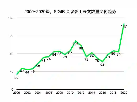 SIGIR的这种变化也反映了信息检索领域的研究热度。在21世纪初,诞生的一大批伟大的公司,如谷歌、百度等,这些公司在技术上的需求带来了信息检索研究的爆发。然后经过十年之后,搜索的核心技术已经成型,导致信息检索研究热度开始下降,信息检索逐渐进入低谷期。