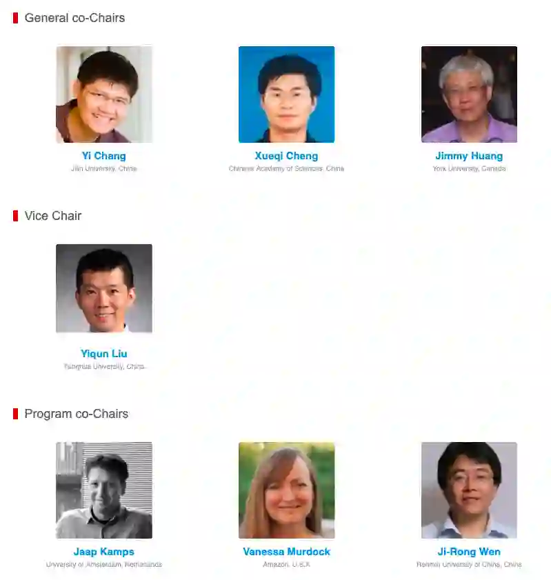 据了解,本届大会共同主席有三位,分别为吉林大学人工智能学院院长常毅,中科院计算所程学旗和约克大学Jimmy Huang。副主席为清华大学刘奕群。而程序委员会主席有人大高瓴智能研究院院长文继荣,荷兰阿姆斯特丹大学Jaap Kamps,美国亚马逊Vanessa Murdock。