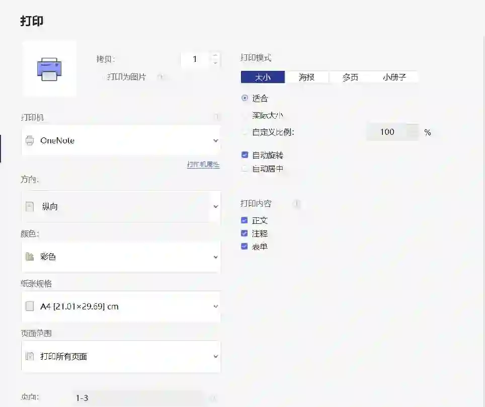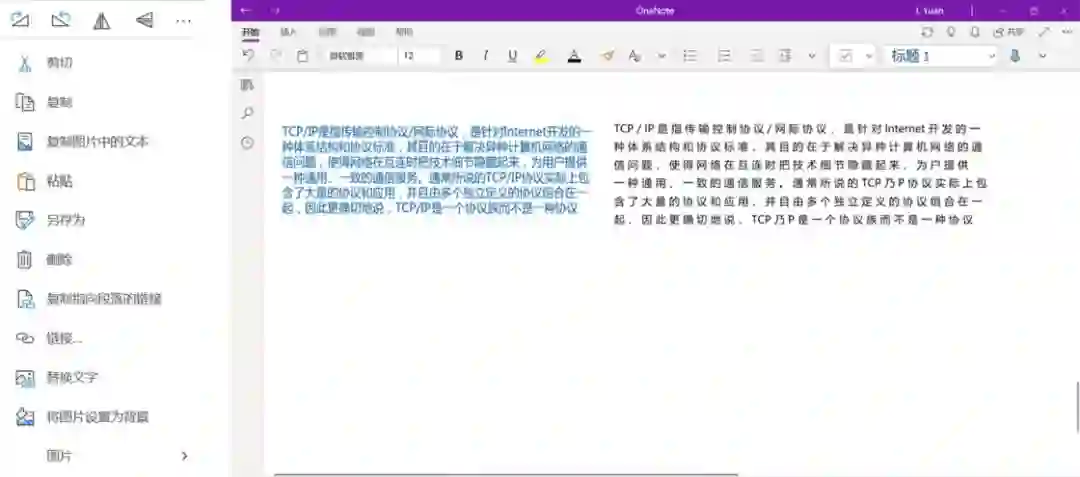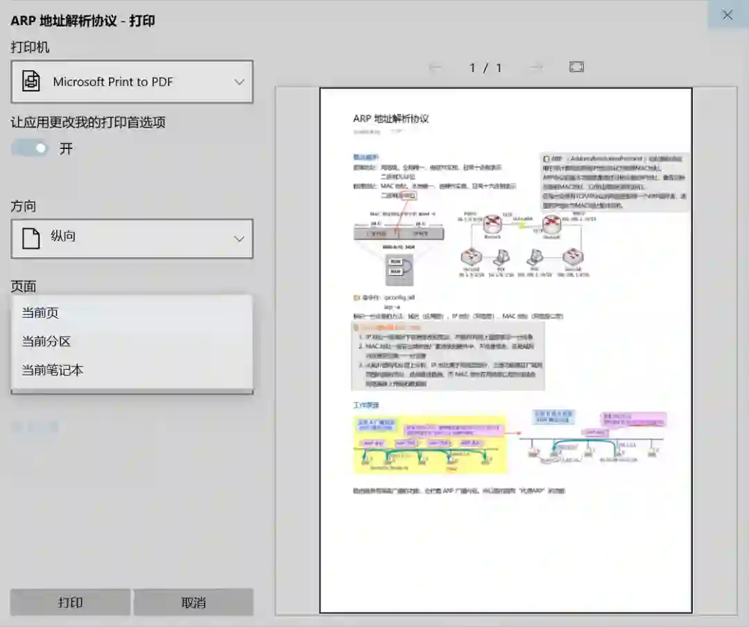 谈及文件插入就不得不提 OneNote 的 PDF 插入功能。OneNote 相当早就引入了这个功能,OneNote 会直接将纸页插入正文,而不需要像印象笔记那样另行打开一个文件圈点,配合「自由的文本框」以及「墨迹」功能,提笔就能批注,拿来看课件和扫描版 PDF 都非常方便,不用再去文件夹里找课件。但是如果用「拖拽」的方式插入 PDF 文件,文件稍大就容易闪退或弹出错误的提示信息。应对这个错误的操作为:使用 PDF 阅读器打开 PDF,并用打印功能「打印至 onenote」。这样不会出现系统报错,而且在插入之前可以调整纸页方向、尺寸等。使用「打印至 OneNote」并设置纸张尺寸插入 PDF 阅读的效果此外, OneNote 也是一早就支持图片文字的 OCR 识别。当把带有文字的图片放入 OneNote 后,只需要片刻,右键菜单项便会出现「复制图片文本」的选项,一般的清晰度 OneNote 都可以识别成功。OCR 识别