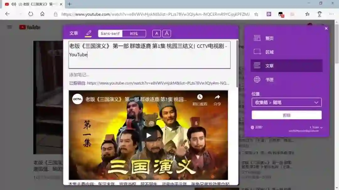 在 Windows 上,OneNote 无需安装插件即可直接实现全局剪藏(在 macOS 上可配合 Chrome 插件使用)。剪裁网页时,OneNote 会提供四个剪辑选项:「整页」「区域」「文章」「书签」。「整页」是对整个页面进行屏幕截图,「区域」则相当于在「整页」的基础上进行截图区域的选择,「文章」是把页面剪辑为易于读取的格式,「书签」则是在 OneNote 里生成一个样式好看的链接,但仍需要跳转阅读。剪辑选项,我一般选择剪辑为「文章」我一般会使用剪辑为「文章」的功能,这样剪辑中速度快且不容易出错,剪辑后格式易读、简洁明了。而剪辑为「整页」的时候,不仅速度慢,还经常会出现打不开的问题,只能打开 Web 端笔记本解决。 选择「剪辑为整页」经常出现的错误提示另外,如果当前页播放的是视频链接,在剪藏时也可识别为视频保存;如果直接在笔记中粘贴视频链接,也可以达到同样的效果(在笔记中无需跳转,但也需联网才能播放)。剪辑视频