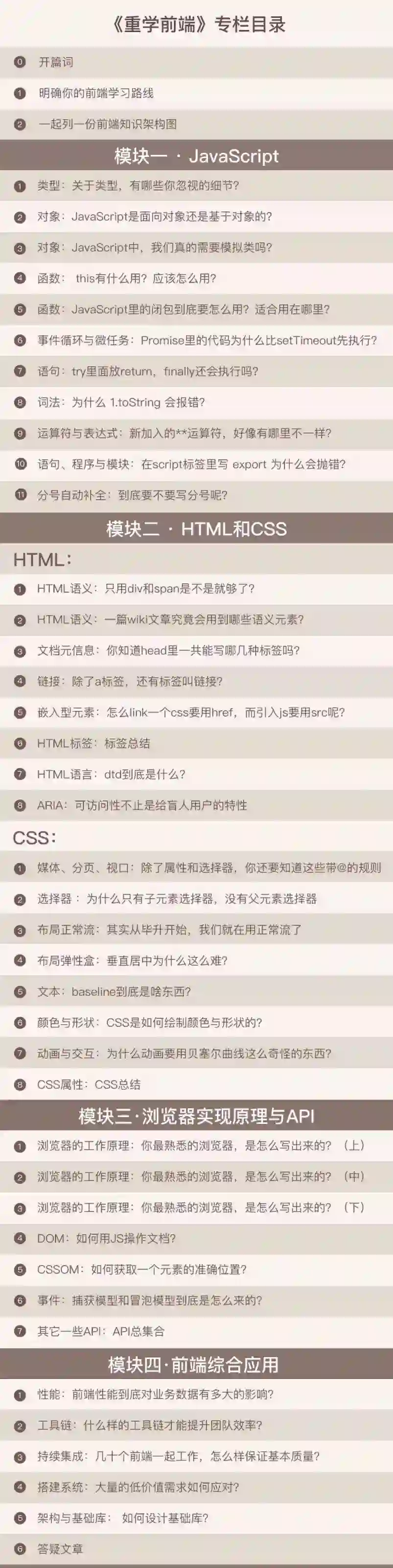 前端知识框架图:专栏有 4 个基础模块,JavaScript 、CSS、HTML和浏览器。