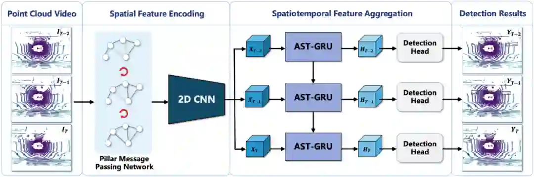 该方法的网络结构如下图所示,它在 nuScenes 的 3D 物体检测数据集上相比于单帧算法有较大提升。