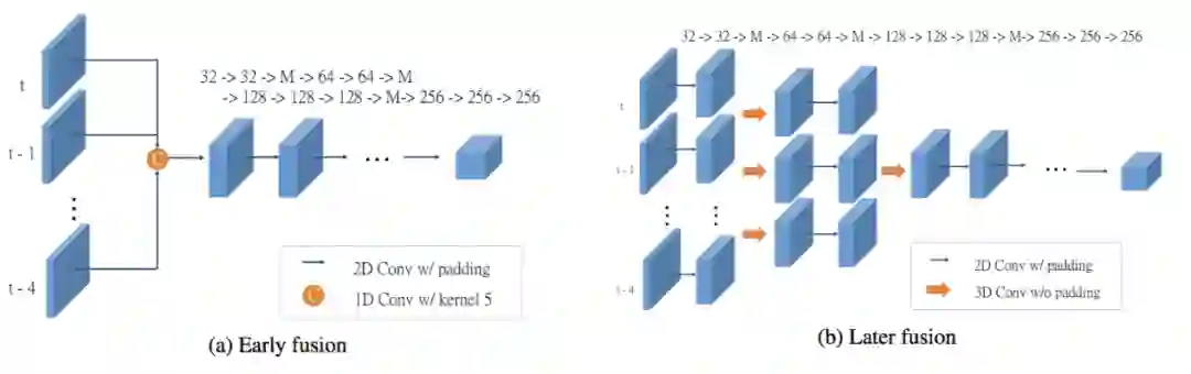 论文中的实验指出,单帧处理需要 9ms,早期融合处理 5 帧需要 11ms;但早期融合的缺点是无法准确地捕捉复杂的运动信息。后期融合(下图b)则采取逐级融合的方式,通过 3D 时空卷积逐步将多帧时序信息融合在一起。
