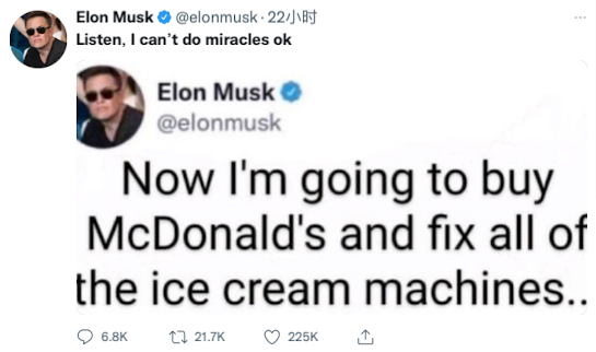 马斯克在Twitter发文称,“接下来我要收购可口可乐公司,再把可卡因重新加进去。”引起网友热议。刚刚马斯克又发帖称,“听着,我不能创造奇迹。(Listen, I can’t do miracles ok)。”并附上了一张其此前表示要收购麦当劳的推文截图。(IT之家)