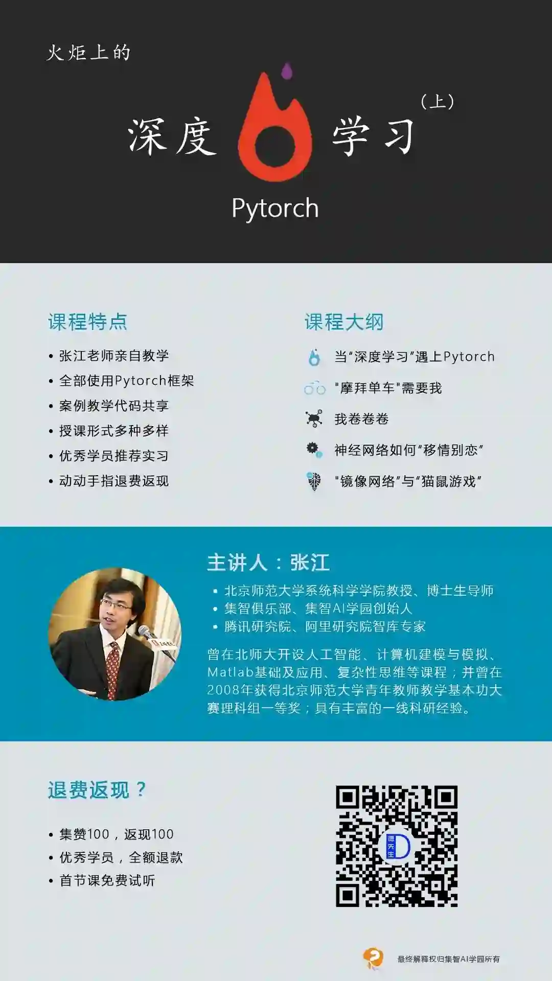 当Deep Learning遇上PyTorch,一切都会变得简单而深刻!深度学习(Deep Learning)作为当今人工智能最关键的技术,不仅在图像识别、图像生成、自然语言处理等领域大显身手,更是AlphaGo、自动驾驶等黑科技的核心。PyTorch则是一款刚刚推出,广受欢迎的深度学习开源框架,非常适合新手快速入门。我们的课程就从PyTorch开始。