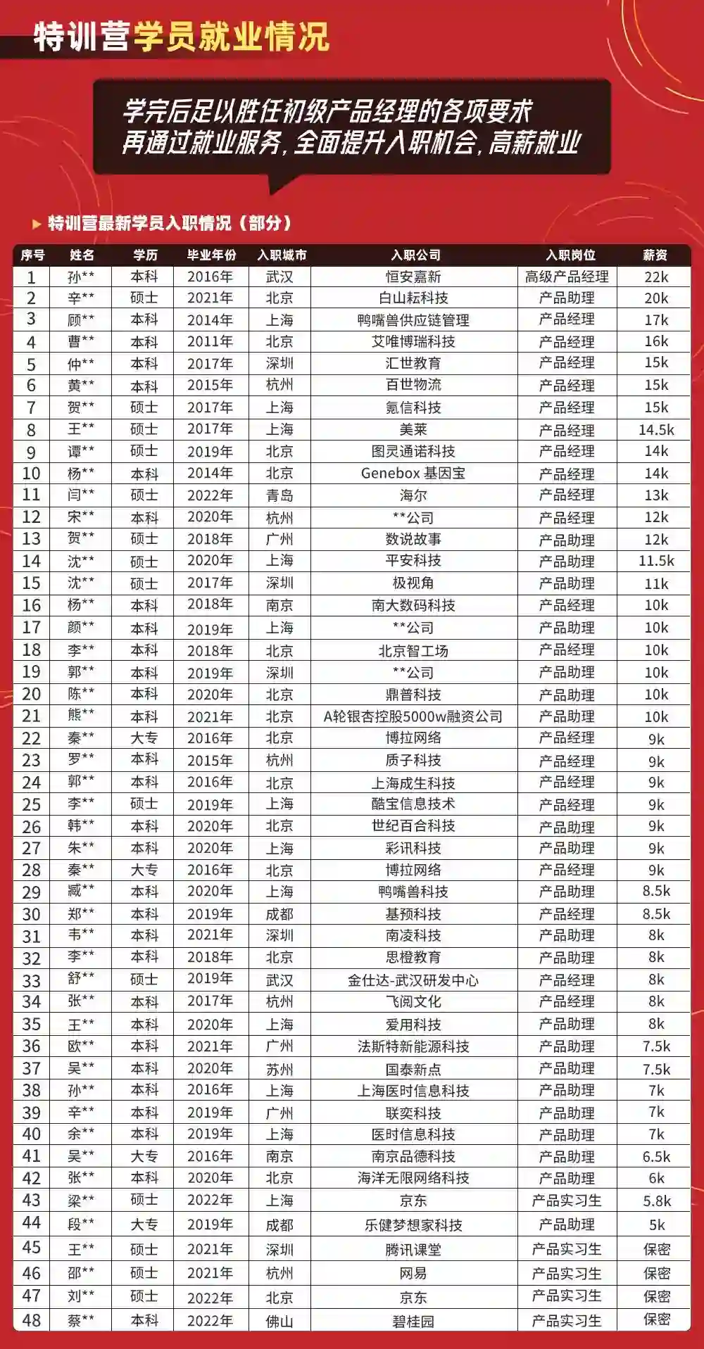 学习的最终目的是成为企业需要的产品人才,成功就业。业内其他产品课程,听完课就“戛然而止”了,导致很多学员依旧不懂互联网公司对产品经理有何要求,如何针对性优化简历,如何寻找适合自己的岗位机会,如何在面试中充分展现自己的产品能力,如何进行合理的薪资谈判……