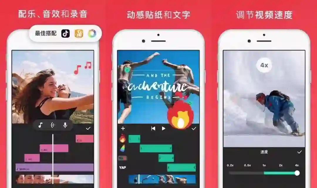 你可以随意添加多个片段的视频。然后可以随意添加音乐贴纸文本。