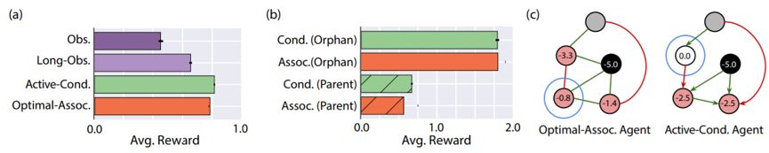 图 2:实验 1。智能体根据观察数据执行因果性推理。a)实验中测试的智能体得到的平均奖励。b)在有外部干预的节点上根据至少存在或不存在一个父节点(分别表示为 Parent 和 Orphan)而划分的表现。c)一个测试 CBN 的测验阶段。绿色和红色边分别表示 +1 和 -1 的权重。黑色表示被干预的节点,绿色和红色节点分别表示该节点的值为正和负,白色表示为零。蓝色圆圈表示该智能体的选择。