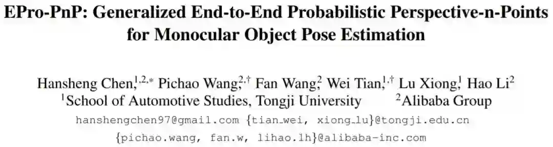 本文解读我们获得 CVPR 2022 最佳学生论文奖的工作《EPro-PnP: Generalized End-to-End Probabilistic Perspective-n-Points for Monocular Object Pose Estimation》。论文研究的问题是基于单张图像估计物体在 3D 空间中的位姿。