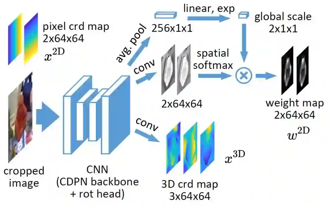 网络结构如上图所示,只是在原版 CDPN 的基础上修改了输出层。原版 CDPN 使用已经检测到的物体 2D 框裁剪出区域图像,输入到 ResNet34 backbone 中。原版 CDPN 将位置与朝向解耦为两个分支,位置分支使用直接预测的显式方法,而朝向分支使用稠密关联和 PnP 的隐式方法。为了研究 EPro-PnP,改动后的网络只保留了稠密关联分支,其输出为 3 通道的 3D 坐标图,以及 2 通道关联权重,其中关联权重经过了 spatial softmax 和 global weight scaling。增加 spatial softmax 目的是对权重 进行归一化,使其具有类似 attention map 的性质,可以关注相对重要的区域,实验证明权重归一化也是稳定收敛的关键。Global weight scaling 反映了位姿分布 的集中程度。该网络仅需 EPro-PnP 的蒙特卡洛位姿损失就可以训练,此外可以增加导数正则化,以及在物体形状已知的情况下增加额外的 3D 坐标回归损失。