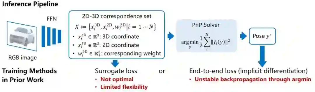 现有方法中,基于 PnP 几何优化的位姿估计方法往往通过深度网络提取 2D-3D 关联点,然而因为位姿最优解在反向传播时存在不可导的问题,难以实现以位姿误差作为损失对网络进行稳定的端到端训练,此时 2D-3D 关联点依赖其他代理损失的监督,这对于位姿估计而言不是最佳的训练目标。