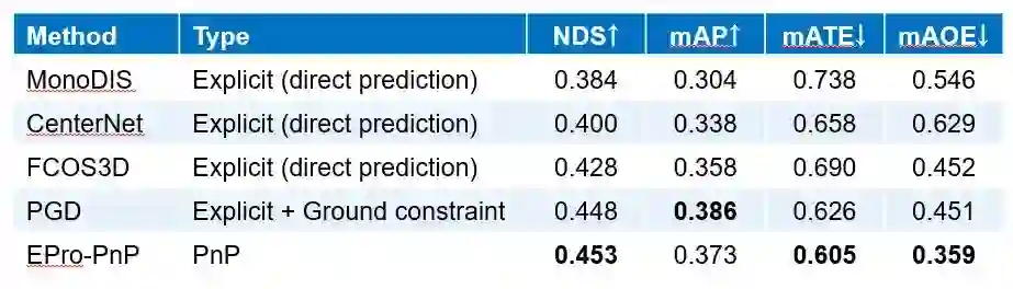 使用 nuScenes 数据集实验,与其他方法对比结果如上图所示。EPro-PnP 不仅相对 FCOS3D 有了明显提升,还超越了当时的 SOTA、FCOS3D 的另一个改进版本 PGD。更重要的是,EPro-PnP 目前是唯一在 nuScenes 数据集上使用几何优化方法估计位姿的。因 nuScenes 数据集规模较大,端到端训练的直接位姿估计网络已具有较好性能,而我们的结果说明了端到端地训练基于几何优化的模型能做到在大数据集上取得更加优异的性能。