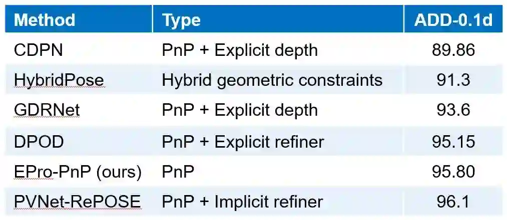 上图是 EPro-PnP 与各种领先方法的比较。由较落后的 CDPN 改进而来的 EPro-PnP 在精度上接近 SOTA,并且 EPro-PnP 的架构简洁,完全基于 PnP 进行位姿估计,不需要额外进行显式深度估计或位姿精修,因此在效率上也有优势。