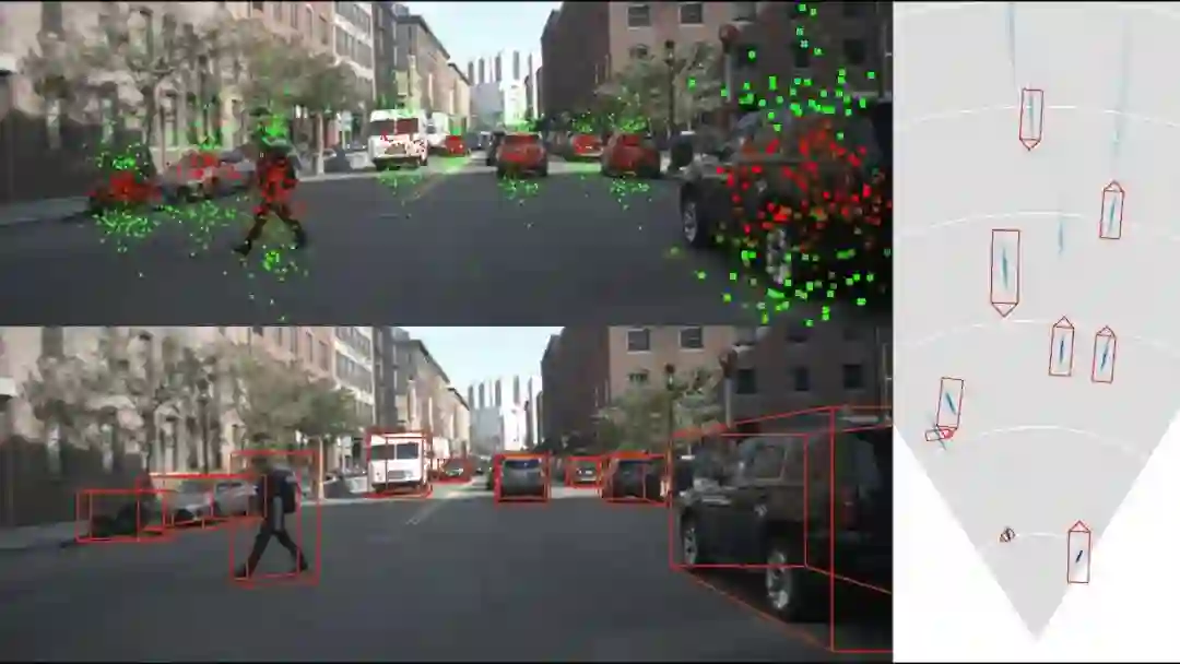 3D 目标检测的结果如上图所示。其中左上视图显示了变形关联网络采样出的 2D 点位置, 红色表示 水平 分量较高的带你, 绿色表示 垂直 分量较高的点。绿色点一般位于物体上下两端, 其主要作用是通过物体高度来推算物体的距离, 这一特性并非人为指定, 完全是自由训练的结果。右图显示了俯视图上的检测结果, 其中蓝色云图表示物体中心点位置的分布密度, 反映了物体定位 的不确定性。一般远处的物体定位不确定性大于近处的物体。