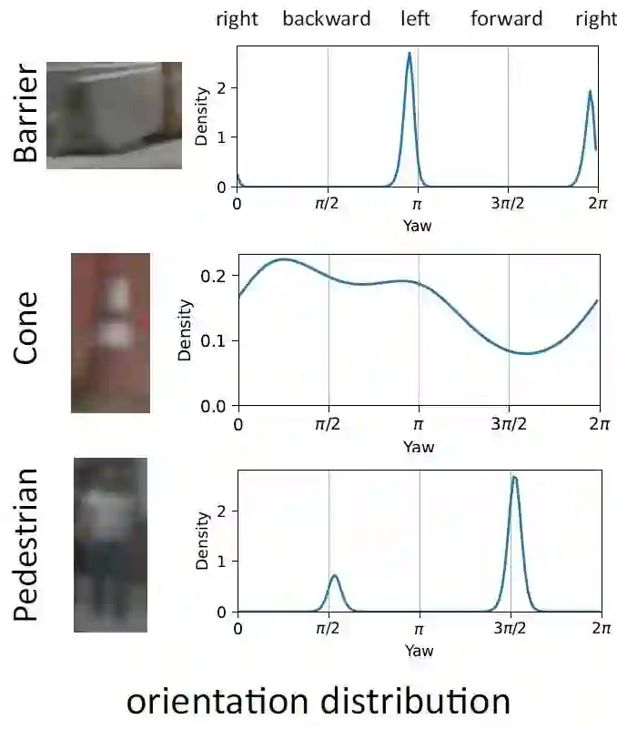 EPro-PnP 的另一重要优势在于,能够通过预测复杂的多峰分布来表示朝向的模糊性。如上图所示,Barrier 由于物体本身旋转对称,朝向经常出现相差 180° 的两个峰值;Cone 本身没有特定的朝向,因此预测结果在各个方向均有分布;Pedestrian 虽不完全旋转对称,但因图像不清晰,不易判断正面和背面,有时也会出现两个峰值。这一概率特性使得 EPro-PnP 对于对称物体不需要在损失函数上做任何特殊处理。