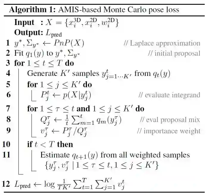 具体而言, 我们采用了一种重要性采样算法一-Adaptive Multiple Importance Sampling (AMIS), 计算出K个带有权重 的位姿样本 , 我们将这一过程称作蒙特卡洛 PnP: