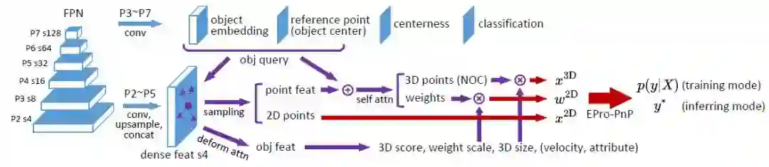 网络结构如上图所示。总体而言是基于 FCOS3D 检测器, 参考 deformable DETR 设计的网络结 构。在 FCOS3D 的基础上, 保留其 centerness 和 classification 层, 而将其原有的位姿预测层替 换为 object embedding 和 reference point 层, 用于生成 object query。参考 deformable DETR, 我们通过预测相对于 reference point 的偏移量得到 2D 采样位置(也就得到了 )。采 样后的 feature 经由 attention 操作聚合为 object feature, 用于预测物体级别的结果 (3D score, weight scale, 3D box size 等)。此外, 采样后各点的 feature在加入 object embedding 并经由 self attention 处理后输出各点所对应的的 3D 坐标 和关联权重 。所预 测的 全部可由 EPro-PnP 的蒙特卡洛位姿损失训练得到, 不需要额外正则化就可以收 敛并有较高的精度。在此基础上, 可以增加导数正则化损失和辅助损失进一步提升精度。