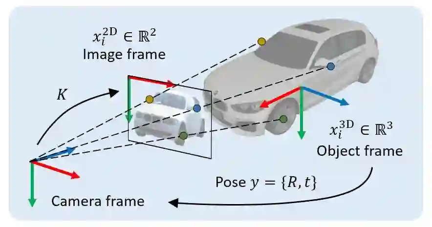 其中 , 表示加权重投影误差, 是位姿的 函数。 表示 含有内参的相机投影函数, 表示元素乘积。PnP 方法常见于物体几何形状已知的 6 自由度位姿估计任务中。