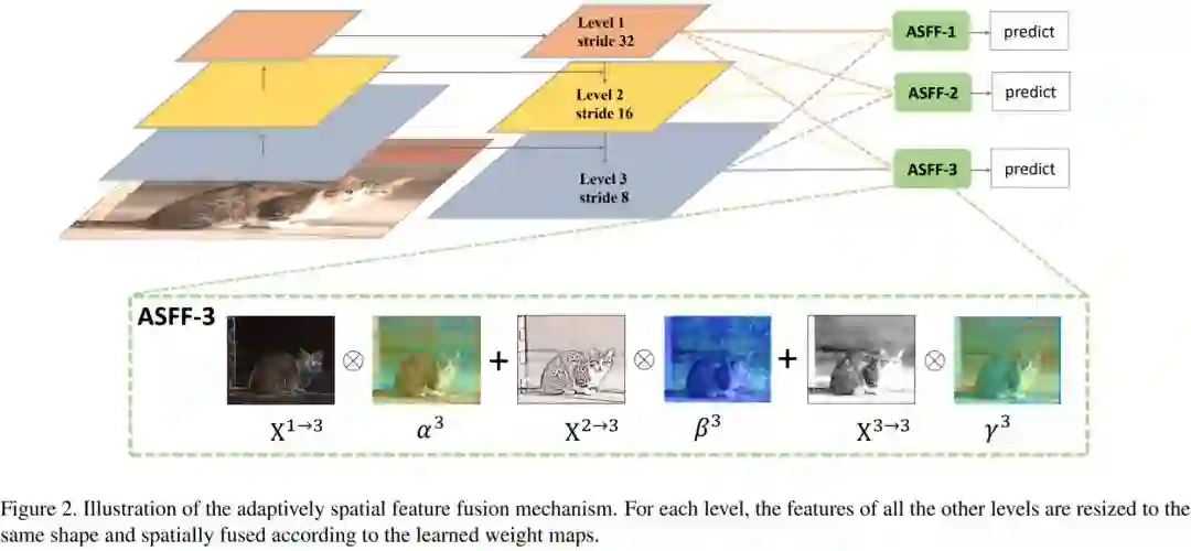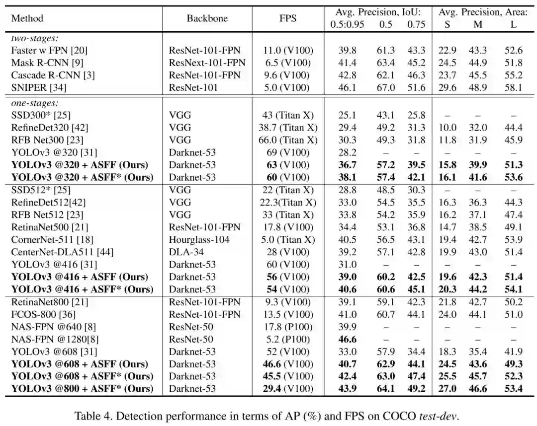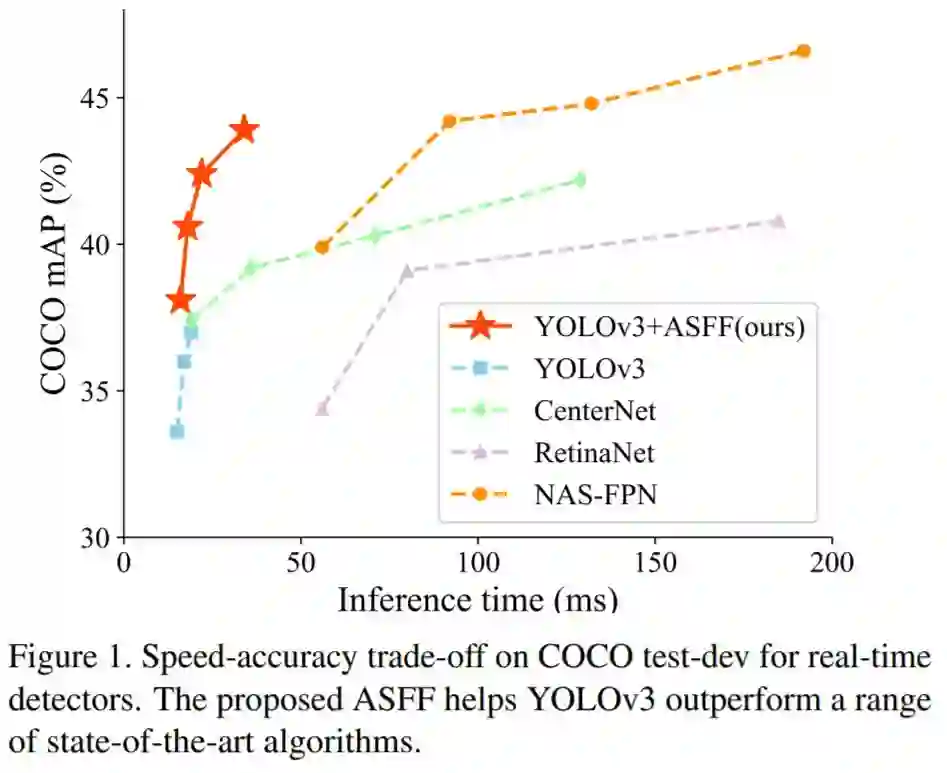 注:YOLOv3+ASFF(自适应空间特征融合)组合,性能优于CornerNet和CenterNet等,在COCO上,38.1mAP/60 FPS,43.9mAP/29FPS!