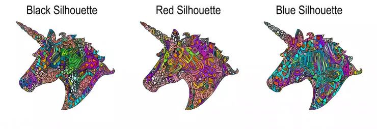 另外,剪影不一定要全部都是黑色的。其实各种颜色就像种子(生成随机数的种子)一样可以生成不同种类的艺术品。我们想要把哪种颜色作为主色来选择剪影颜色(注意:黑色就像一个分界颜色——它是中性的)。