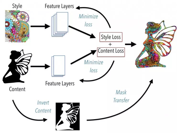 这个框架是在Gatys的风格迁移算法为基础做一些小改动。我们的做法是,内容图片是一张剪影,风格图片可以是任何图案(从简单的黑白涂鸦到更复杂的色彩镶嵌)。这段代码包含了转换图案和创建基于内容图片的掩模,它们最终都会被用到生成图案中。
