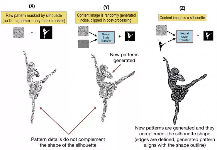 把剪影用作内容图片当然有它的好处。以楼下三个生成的艺术作品为例。(X) 就是从原始图案直接抠图到舞者形状里的。(Y)是由白噪音加到内容图片上生成图案,然后抠图到舞者形状上,构成了最后的图片。(Z)是把剪影作为内容然后用掩模迁移来剪出最后的图片的。