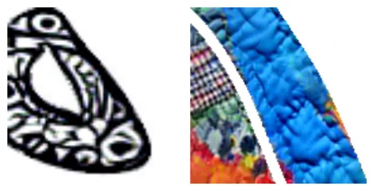 沿着边边卡准的图案(左)和沿着边边的被子针脚(右)