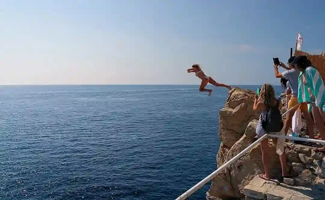古城南侧海边有个悬崖咖啡店,一群来自美国的年轻男女在悬崖跳水。钴蓝色的海水中白帆点点,港口渡轮往来密集,但海水仍清澈见底。