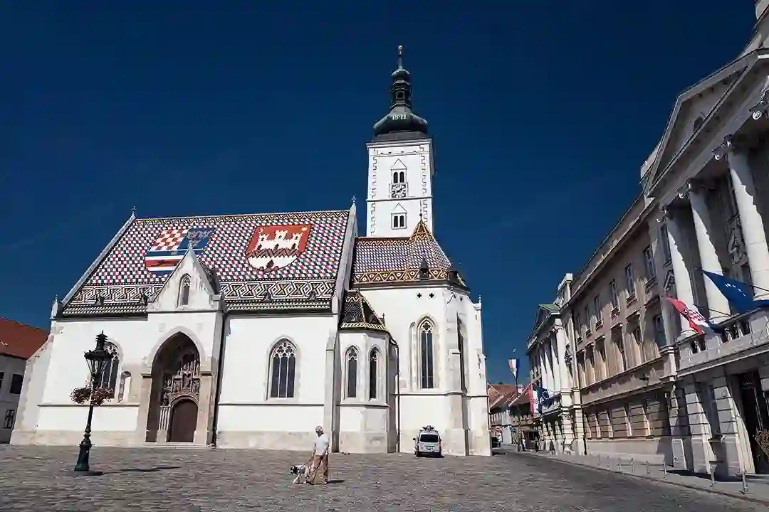 圣马可教堂绚丽的马赛克屋顶让人想起克罗地亚国旗。教堂前的广场见证了一个个决定国家命运的关键时刻。1918年,无数民众聚集在此,宣布克罗地亚正式脱离奥匈帝国。1991年6月25日,宣布克罗地亚脱离南斯拉夫联盟独立也在此。