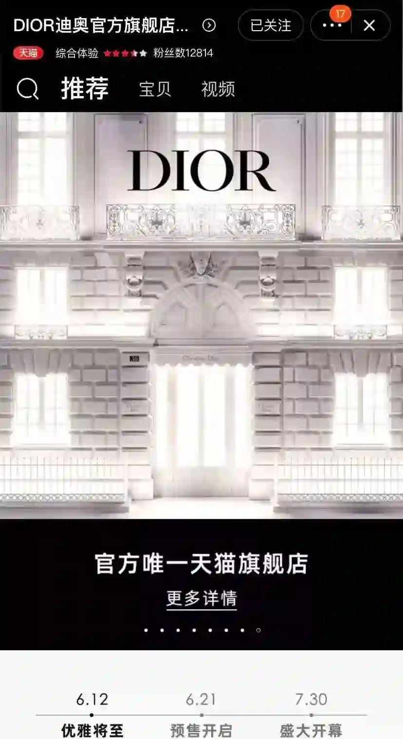 36氪获悉,6月14日,刚刚推出了全新的Bobby手袋系列的Dior,低调入驻天猫,开出了“官方唯一天猫旗舰店”。旗舰店首页上显示,诸多品牌即将在7月底盛大开幕。Dior的明星产品Miss Dior香水系列、烈艳蓝金唇膏都在该店首屏推广之列。