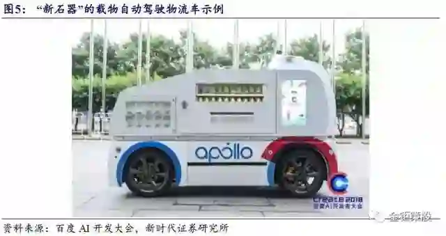 我们认为,各类创业公司基于百度提供的软硬件解决方案深耕自动驾驶的特定场景应用将会成为特定场景自动驾驶产业化的主要模式之一。典型代表如创业公司“新石器”与百度合作研发的自动驾驶物流车。该车已在雄安和常州投入使用,搭载了激光雷达、视觉感知、RTK和惯性导航方案,有麦佛逊式独立悬架,4G三网全互联。该车可以20公里的时速实现5公里半径的物流运输任务;具有插拔式换电方案,支持24小时不间断运营;具有智能模块化货箱,可快速便捷的替换不同需求功能的货箱,满足更多场景需求。