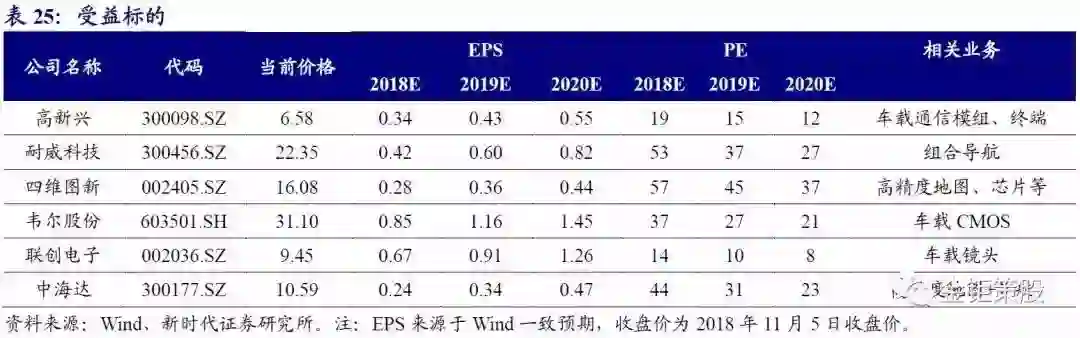 综合考虑技术成熟度、成本、应用场景等因素,我们看好A股上市公司在车载通信设备、视觉传感器零部件、车载芯片、高精度地图,导航方向的突破潜力。受益标的包括:高新兴(车规级通信模组)、耐威科技(导航)、四维图新(高精度地图+车载芯片)、韦尔股份(车载CMOS芯片)、联创电子(车载ADAS摄像头)、中海达(高精度地图+导航)等。