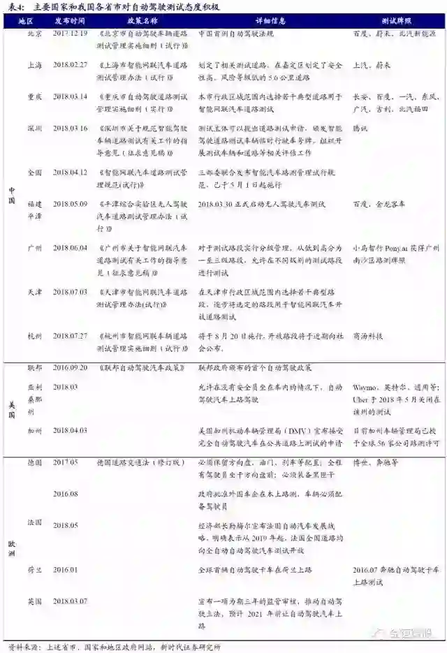 国内外的政府机构对自动驾驶技术发展都持鼓励态度,并积极推进自动驾驶政策落地。目前,全球大部分政府允许在配备安全驾驶员的前提下,进行自动驾驶车辆的路测。美国加州和亚利桑那州已在推进完全自动驾驶车辆的测试。我们认为,随着自动驾驶技术的进一步成熟,各国政府会加大开放力度在保证公共安全的前提下支持科技创新。